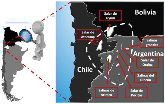 It is estimated that about 66% of the world’s lithium resources are housed in South American continental brines in the so-called Lithium Triangle, which includes deposits in Bolivia, Chile, and Argentina (Figure 1). There are also inland brine resources in the southeastern United States, Australia, Israel, China, and Tibet. The most extraordinary example is the Salar de Atacama in Chile, with its nearly 3000 km2, it has an average lithium concentration of 0.14%, the highest known, with resources estimated at 9.1 million tons, which allows the production of more than 45 million tons of equivalent lithium carbonate. Albemarle’s Silver Peak lithium mine in Nevada is the only lithium operation from inland brines in the United States [4].