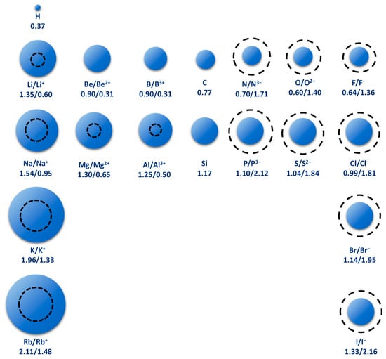 Figure 3. Relative atomic radii of some elements compared to the atomic radius of ions. The atomic radius is expressed in units of Å. The solid sphere represents atoms and the dashed circle represents ions (modified from: [4]). - SO4/Li Ratio: This parameter determines if the deposit is lithium chloride (low SO4/Li) or lithium sulfate (high SO4/Li). At a high ratio, lithium sulfate salts typically begin to precipitate from lithium concentrations between 0.5% and 1% [14]. The determination of the type of deposit can alternatively be identified through the SO4/Mg ratio (see Table 2).