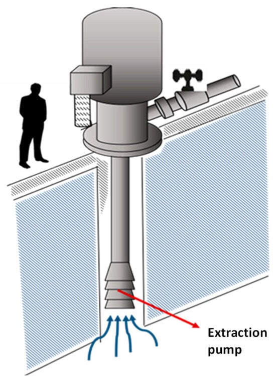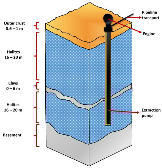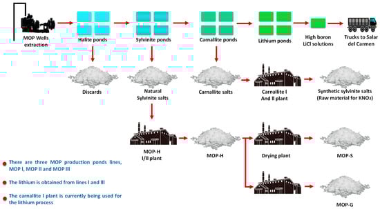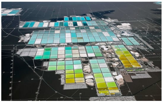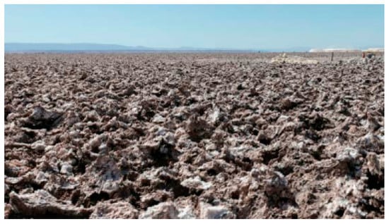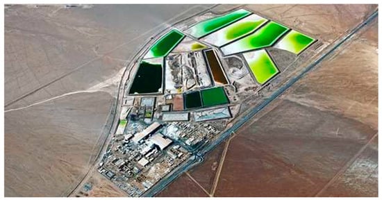 The productive process from the brines under the salt crust of the Salar de Atacama begins with the exploration and hydrogeological characterization of the nucleus, to then suck the brines through pumps at depths greater than 40 m [27] from more than 380 active wells (see Figure 7).
