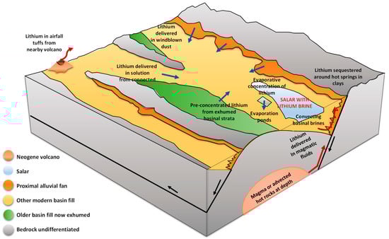 In general, the formation of lithium brines in the world has its origin in the flows of groundwater and surface water [23,32] that converge in endorheic basins that, with the support of evaporation, concentrate solutes, leading to the precipitation of highly concentrated salts and brines. It must be considered that, unlike sodium, potassium, and calcium, lithium is highly soluble; therefore, it does not easily produce evaporites when concentrated by evaporation. On the contrary, it ends up contained in residual brines in the superficial subsoil. Different hypotheses have been described to explain the origin of lithium in the Salar de Atacama (see Figure 5); however, the extraordinary contents of this element continue to be the focus of discussion [31], given that regardless of its origin, the brine necessarily had to undergo some subsequent concentration process to bring the low lithium contents from the diluted recharge to the levels measured today in the most enriched zone around Salar Fault Systems. Among the hypotheses, it is suggested that lithium enrichment comes from processes of weathering of volcanic rocks at low temperatures, volcanic fluids (magmatic origin), hydrothermal leaching of underground salt flats, or current filtrations in the salt flat [30].