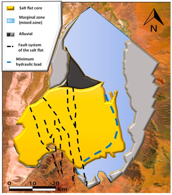 Munk et al. [25] concluded that more than half of the Li in the halite nucleus originates from the eastern flank, while Jordan et al. [29] have raised the importance of the Salar Fault System (SFS), along which the rise of groundwater flows from the east take place, thus feeding the halite aquifer in the nucleus. The possibility of these groundwater flows evaporating on their way to the SFS has also been studied, thus increasing the concentrations of dissolved salts, including lithium.