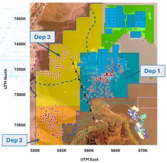 Among the particularities of the Salar de Atacama is not only the extraordinary lithium content, but also that it is very widespread within the halite nucleus, and is not restricted to a specific area [19]. It should be considered that lithium concentrations exceed 1000 mg/L in many sectors of the nucleus, with maximums of up to 5000 mg/L in the southern sector, near the Cordón de Lila [31].