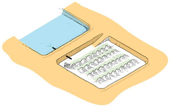 The second stage is aimed at waterproofing the already flattened pond, as well as the slopes. For this, a layer of 300 g/m 2 geotextile joined by thermofusion is used, on which a 0.75 mm thick PVC waterproof membrane is placed. To waterproof the slopes, another layer of 150 g/m2 geotextile is placed, which in turn is also covered with an HDPE membrane of 0.5 or 1 mm thickness [35]. To ensure the projected useful life of the waterproofing layers, a layer of halite salts approximately 30 cm thick is superimposed, which must be capable of attenuating the impact caused by the transfer of heavy machinery over the pond during the salt harvest period.
