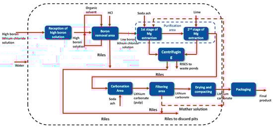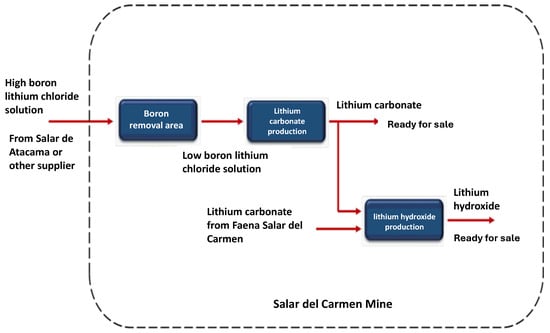 During the evaporation process, a brine is obtained that contains a progressively higher concentration of the most soluble components, such as lithium and boron, compared to other ions such as potassium and sodium, which have decreased their content. in the most concentrated systems at the end of the evaporation process [17]. In addition to magnesium, boron, potassium, and sodium, this brine has low calcium and sulfate contents, which must be removed anyway before conversion to lithium carbonate.