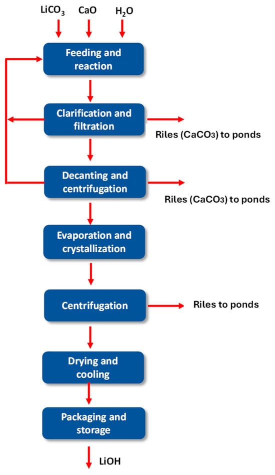 Lithium hydroxide production uses lithium carbonate as the main raw material [45,46]. This process has several stages, among the most important are as follows: