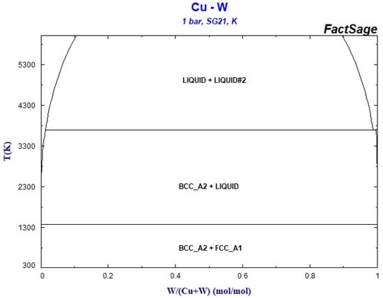 In this study, the alloy material CuW80, commonly used for high-voltage circuit breaker contacts, is selected as the research object. Based on the properties of the Cu and W elements, and according to the Cu-W alloy phase diagram in Figure 1 [,], it can be seen that the melting points and boiling points of copper and tungsten elements differ greatly, and the two neither dissolve with each other nor form intermetallic compounds. Thus, the elements that make up the Cu-W alloy exist in independent phases. The Cu-W alloy combines the excellent properties of Cu and W elements, which not only shows the excellent electrical and thermal conductivity of Cu elements but also has the ultra-high melting and boiling points, high hardness, and low thermal expansion coefficient of W elements, especially the resistance to high-temperature oxidation.