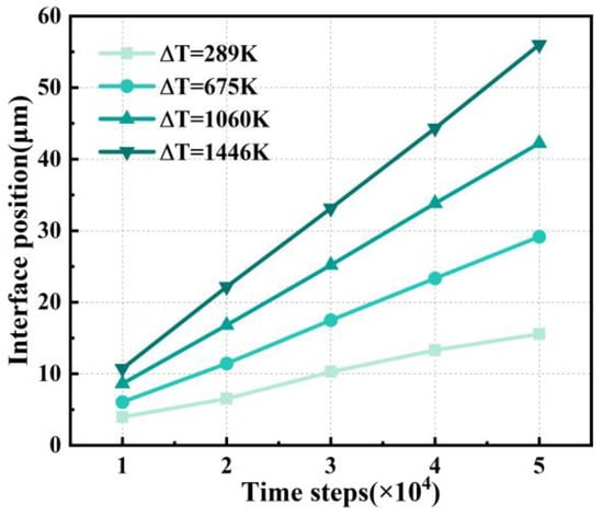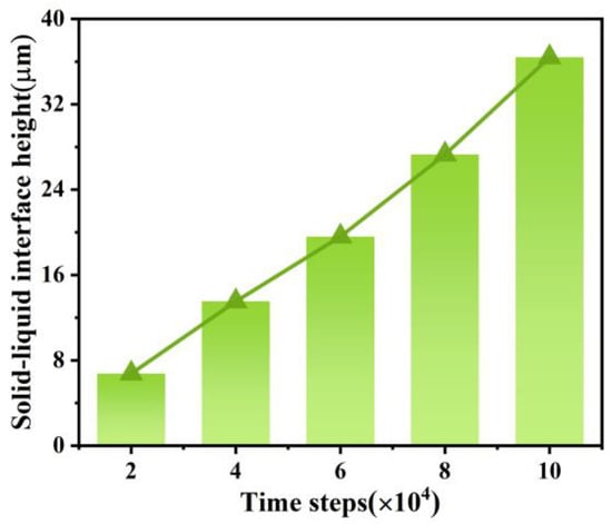 Figure 4 illustrates the change in solid–liquid interfacial position at different timesteps. It can be observed that the interface position increases proportionally with the evolution time, showing no significant fluctuations.