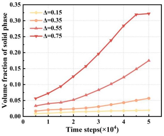 The variation in the solid-phase volume fraction at different timesteps with ε = 0.03 and Δ = 0.45.