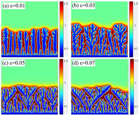 The dendrite morphology at different anisotropy coefficients with Δ = 0.45: (a) ε = 0.01, (b) ε = 0.03, (c) ε = 0.05, (d) ε = 0.07.