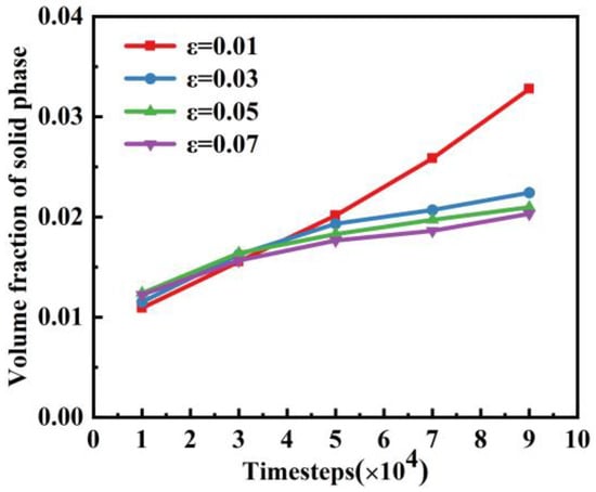 The variation in the solid-phase volume fraction at different dimensionless supercooling degrees with ε = 0.05.