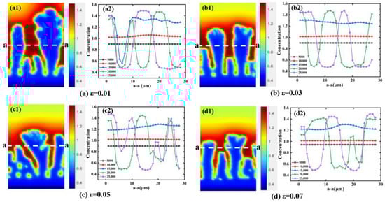 To further investigate the influence of anisotropy on the growth of primary dendrites, a statistical analysis of the solute distribution is carried out at a fixed position (a–a) for different anisotropy coefficients [,,]. Figure 11 is a partially enlarged view of the early form of Figure 8. The morphological and concentration changes in the solidified tissue from top to bottom are as follows: Figure 11(a1–d1) depicts the typical evolution sequence from dendritic to seaweed-like structures and tip splitting in the solute field. Figure 11(a2–d2) illustrates the solute distribution along the white line (a−a) at different times. In the early stage, the alloy solute concentration gradually increases and remains relatively stable. However, the apparent fluctuations in the solute profiles show that both the dendritic and solute distributions become significantly unstable with increasing anisotropy coefficient. When the timestep is constant, the larger anisotropy results in more complex dendritic morphologies and branches. Moreover, the narrower main dendritic arms lead to smaller inter-dendritic spacing. These results indicate that the increased anisotropy coefficient induces dendritic variations and accelerates the dendritic growth.