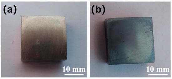 In order to achieve the theoretical minimum value of corrosion, the specimens were pre-oxidized [18]. The specific steps were as follows: The specimen was polished and ultrasonically blown dry and then put into the alumina crucible, which was put into a muffle furnace later. Then, the temperature was increased from room temperature to 800 °C at 10°/min and held for 2 h. After cooling with the furnace and removing the specimen, the dimensions and weight of the specimen were recorded. Figure 1 shows the polished (a) and pre-oxidized (b) specimens. The surface of the pre-oxidized specimen showed an indigo-blue luster.