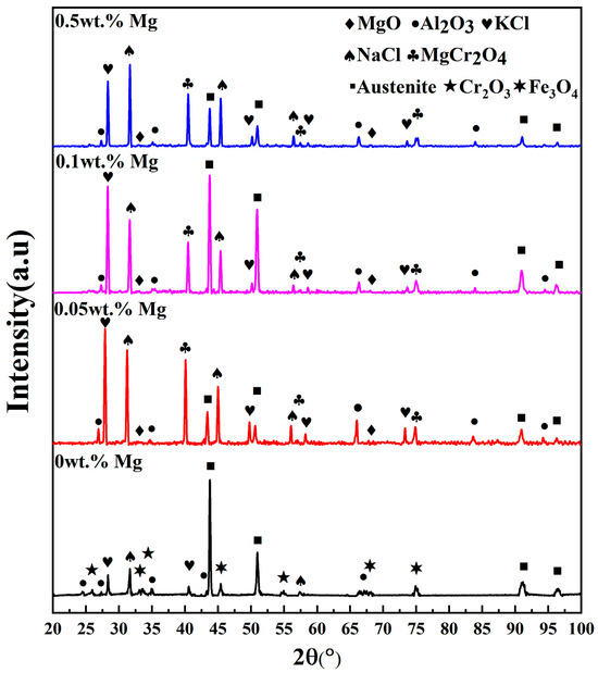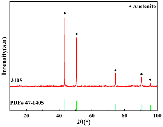 The XRD patterns of 310S specimens before corrosion are shown in Figure 2. As can be seen in Figure 2, the austenitic phase was detected in XRD, and the 310S alloy before corrosion was an austenitic steel. The XRD patterns of the specimens corroded with different Mg contents after 360 h are presented in Figure 3. According to Figure 3, the corrosion products of Sample 1 are Al2O3, Cr2O3, and Fe3O4. However, Samples 2–4, with three different Mg contents, display Al2O3, MgO, and MgCr2O4 as their corrosion products. Compared to Sample 1, a significant increase in MgO and MgCr2O4 is observed as a result of adding the Mg inhibitor. However, Cr2O3 only appears in Sample 1, as the Cr element does not participate in the corrosion reaction and only contributes to the formation of MgCr2O4 in Samples 2–4. Therefore, it can be concluded that the addition of Mg powder influences the generation of corrosion products.