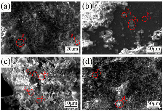 Figure 4a depicts the surface morphology of Sample 1 after 360 h of corrosion. White spherical particles (corrosion product a1) and flower-shaped corrosion product a2 are observable on the surface. An EDS analysis of the white spherical corrosion product a1 indicated that its corrosion product is Al2O3. In Table 3, the floral corrosion product a2 is identified on the basis of atomic percentage as a mixture of Al2O3, NiO, and NaCl.
