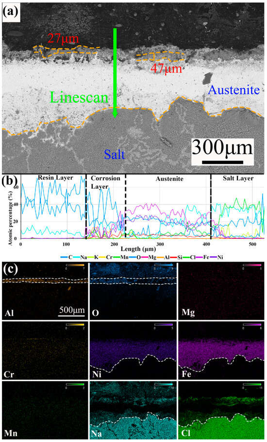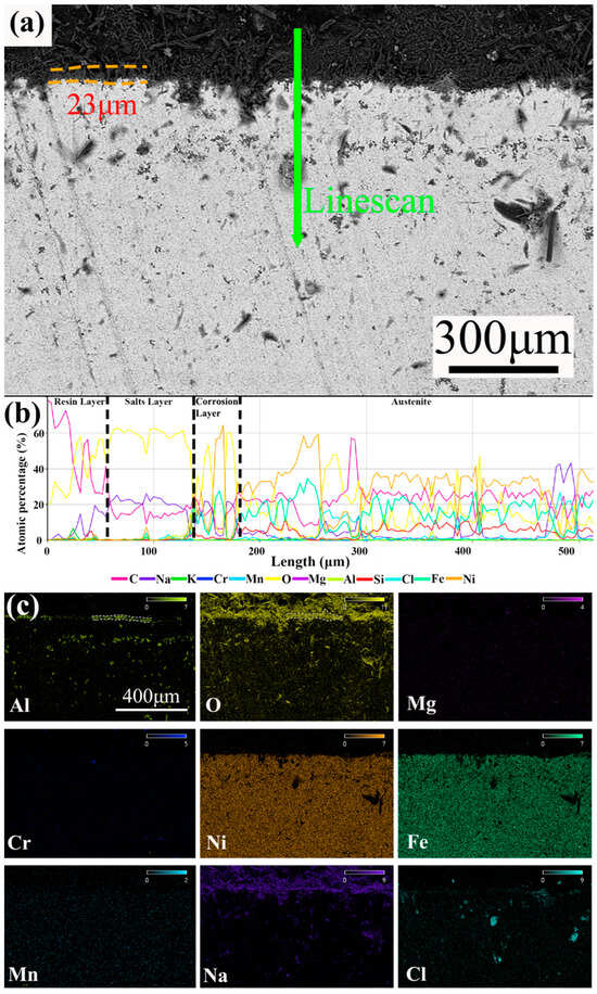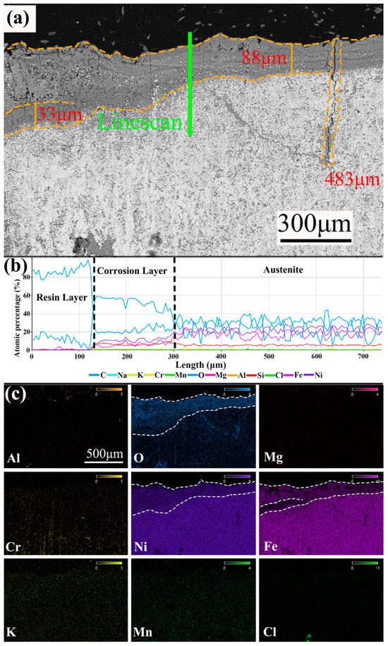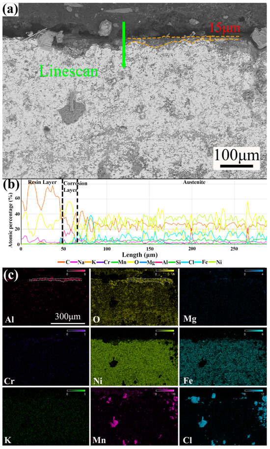 Corrosion cross-section of the specimen in Sample 2. (a) 260 × SEM; (b) EDS line scan; (c) EDS mapping.