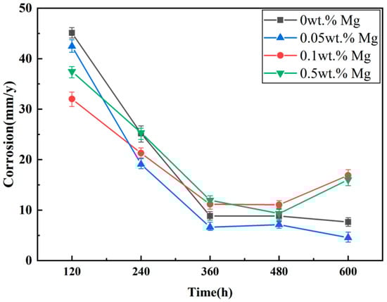 - The corrosion rates of the test alloys were, in order, 0.05 wt.% Mg < 0 wt.% Mg < 0.1 wt.% Mg < 0.5 wt.% Mg. The specimen with 0.05 wt.% Mg added had a corrosion layer thickness of 33 μm and had the lowest corrosion rate of 6.623 mm/y. For 310S stainless steel with aluminum, the best corrosion inhibition was achieved by adding 0.05 wt.% Mg in chloride salt.
