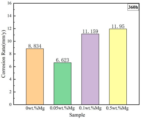Corrosion rate diagram of 310S stainless steel with aluminum at 650 °C for 360 h in molten salt with different magnesium contents.