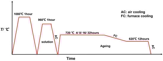 Wire arc additive manufacturing technology is based on a discrete/accumulation principle. The arc is used as a moving heat source to continuously melt the welding wire, and then a rolling force is applied to the semi-solid molten pool, which is then cooled and deposited on the substrate. The welding current is 150 A, the voltage is 12 V, the wire feeding rate is 1.0 m/min, the rolling force is 20 kN, and the welding rate is 120 mm/min. A welding process using high-purity argon protection is used, followed by a micro-casting and forging process during the deposition process to achieve the hot rolling of the alloy. Subsequent heat treatment and mechanical property testing were carried out on the round bar samples cut along the direction parallel to the deposition direction. The sample size was Φ13 mm × 100 mm. The time–temperature transformation curve of Inconel 718 alloy [20,21] was used to formulate the homogenization heat treatment process before ageing, which was homogenized at 1080 °C for 1 h, followed by air-cooling to room temperature. The purpose was to eliminate the Laves phase, make the element Nb return to the matrix, and inhibit the element segregation [22]. After solution treatment at 960 °C for 1 h, the alloy was cooled to room temperature, and then aged at 720 °C for 4 h, 8 h, 16 h, and 32 h; it was then cooled to 620 °C for 12 h, and then air-cooled to room temperature (Figure 2).