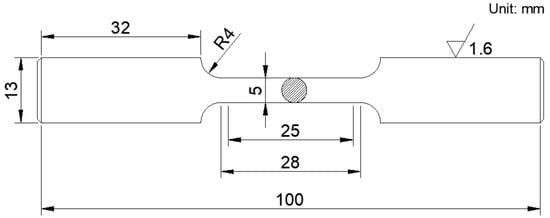 According to the national standard ASTME9 [23], the aged GH4169 alloy was processed into a standard tensile rod sample, whose specific size is shown in Figure 3. Then, the mechanical properties of the alloy at room temperature were tested using an INSTRON8801 testing machine from NSTRON Corporation, USA. The tensile rate was 0.075 mm/min, and the yield strength was calculated using the 0.2% offset method [24]. Three samples for each ageing time were tested to calculate the mechanical properties error.