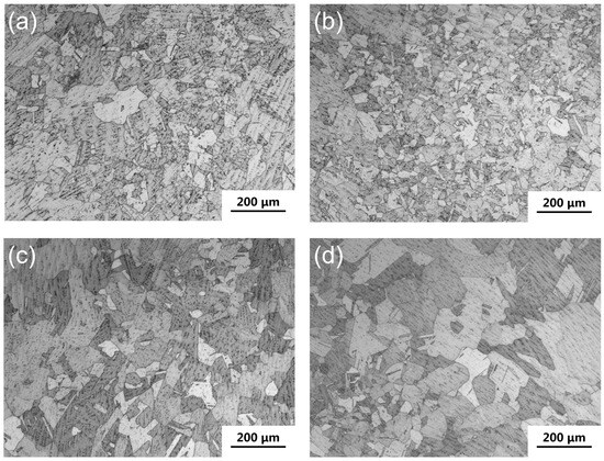 Optical microscope microstructure of GH4169 alloy at different ageing times: (a) 4 h; (b) 8 h; (c) 16 h; and (d) 32 h.