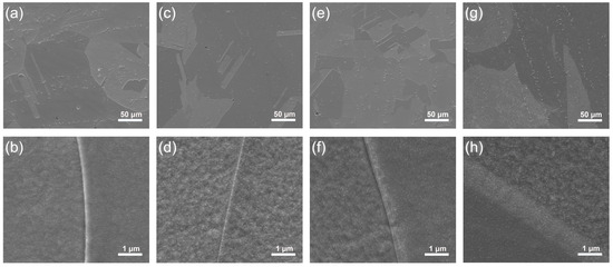 The microstructure of GH4169 nickel-based superalloy after ageing for different times under scanning electron microscope: (a,b) 4 h, (c,d) 8 h, (e,f) 16 h, and (g,h) 32 h.