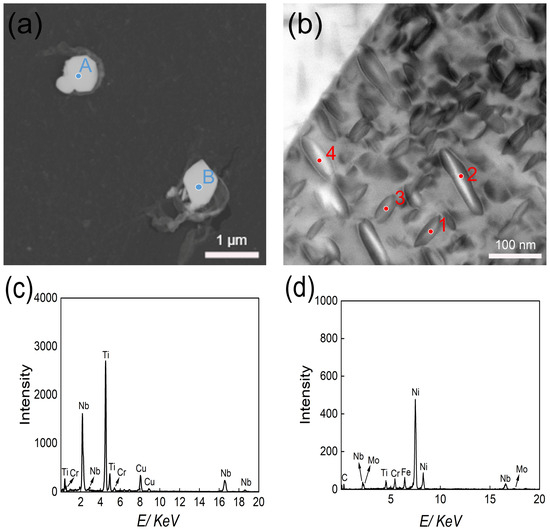 Morphology and energy spectrum of GH4169 alloy aged for 4 h and 16 h under transmission electron microscope: (a) the precipitated phase in the replica sample, A and B are precipitated phases; (b) the precipitated phase in the flake sample, 1, 2, 3 and 4 are precipitated phases; (c) the energy spectrum diagram of the precipitated phase A in (a); and (d) the energy spectrum diagram of the precipitated phase 2 in (b).