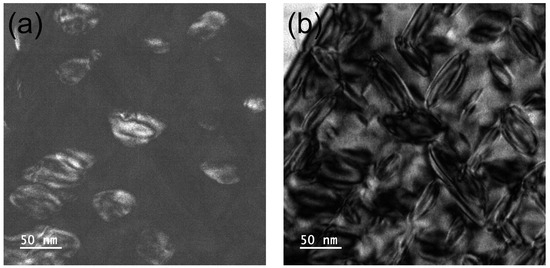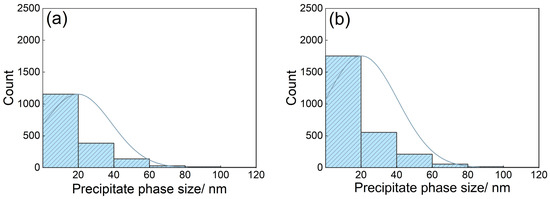 Figure 10 shows the size of the precipitated phase at different ageing times counted using the Image-pro-plus software. The calculation method is to select the area of 3 microns × 3 microns in the transmission electron microscope photo and select at least five regions for statistics. The alloy after ageing treatment for 16 h has more precipitated phases than the alloy after ageing treatment for 4 h, and all precipitated phases are less than 50 nanometres in size. The precipitation temperature of γ′ phase is 593–816 °C, and the optimum precipitation temperature is about 620 °C [30,31]. The precipitation temperature of γ″ phase is 595–870 °C, and the optimum precipitation temperature is about 720 °C [32]. The extension of the ageing holding time at 720 °C is more conducive to the precipitation of the main strengthening phase γ″. On the one hand, small-sized precipitates continue to precipitate. However, at the same time, the original precipitated phase will inevitably coarsen; therefore, the average size of the precipitated phase does not change much. The content of γ″ precipitated phase becomes increasingly dispersed, the precipitation strengthening effect is more significant, and the mechanical properties of the material are improved significantly.
