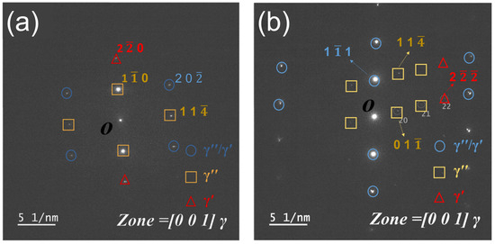 Diffraction spots of precipitated phase under transmission electron microscope: (a) ageing for 4 h; and (b) ageing for 16 h.