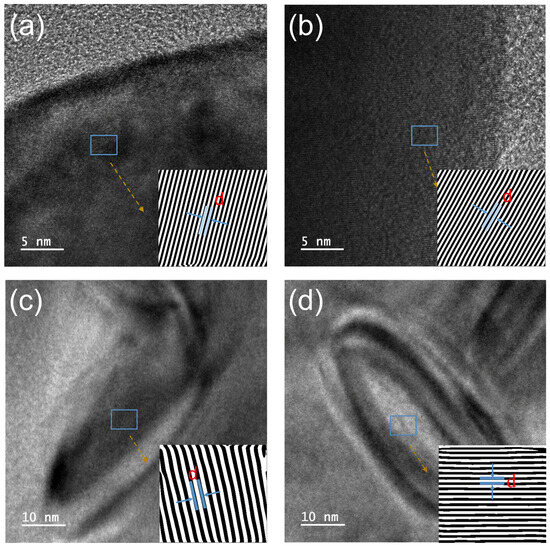High-resolution imaging, the lower right corner is the crystal plane spacing of the selected area after fast Fourier transform and inverse fast Fourier transform, (a,b) sample ageing for 4 h; and (c,d) sample ageing for 16 h.