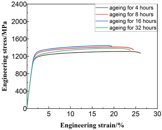 Figure 11 shows the engineering stress–strain curve of GH4169 alloy. The wire arc additive manufacturing and micro-cast forging GH4169 alloy have high strength and plasticity after ageing for 4–32 h, but the strength and plasticity are slightly different at different ageing times. When the ageing time is 4 h, the yield strength and tensile strength of GH4169 alloy are the lowest; the yield strength is 1164 ± 14 MPa, the tensile strength is 1314 ± 18 MPa, and the elongation is about 26%. The tensile strength and yield strength are higher than the room temperature performance σb > 1240 MPa specified in the forging technical standard σ0.2 > 1040 MPa [33]. When the ageing time is extended to 16 h, the maximum yield strength is 1287 ± 22 MPa, the tensile strength is 1447 ± 19 MPa, and the elongation is about 19.5%. When the ageing time is extended to 32 h, the yield strength decreases to 1191 ± 21 MPa.