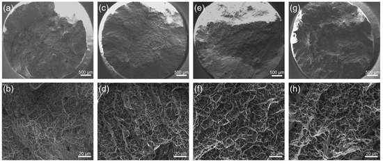 The fracture morphology of GH4169 alloy after ageing for different times obtained by scanning electron microscope: (a,b) 4 h; (c,d) 8 h; (e,f) 16 h; and (g,h) 32 h.