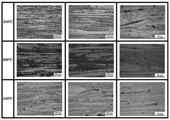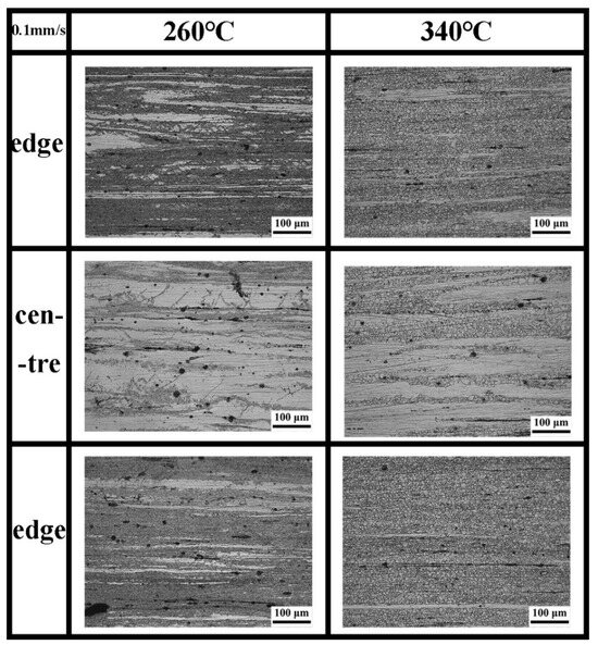 Extrusion temperature and extrusion speed are the two key variable parameters in this study. The microstructural evolution of the Mg-4Zn-1Mn-0.5Ca alloy extruded at a constant speed of 0.1 mm/s, under varying temperatures (260 °C, 300 °C, and 340 °C), is shown in Figure 2, At the same time, in order to observe the change in the whole grain and the local coarse grain, sampling observation was carried out at different magnifications. From the optical microscopy (OM) images, it can be observed that as the extrusion temperature increases, the fraction of recrystallized regions within the alloy also increases. Simultaneously, the size of the recrystallized grains in these regions is gradually enhanced. The reduction in grain size correlates with an improvement in the alloy’s yield strength. During plastic deformation, fine grains allow dislocation slip to occur more evenly across multiple grains, which helps distribute deformation uniformly and reduces the likelihood of stress concentration. Additionally, grain boundary sliding can further aid in accommodating deformation, contributing positively to the material’s ductility [10]. Grain size, therefore, not only influences the yield strength of the magnesium alloy but also affects its tensile strength [11]. As the grain size decreases, both the tensile strength and elongation at fracture improve, indicating that fine grains have a beneficial effect on enhancing the overall strength and plasticity of the magnesium alloy. Furthermore, with increasing extrusion temperature, the number of non-recrystallized deformed coarse grains decreases. The secondary phase in the alloy, consisting of particles and bands, shows no significant change in morphology or distribution with varying extrusion temperatures.