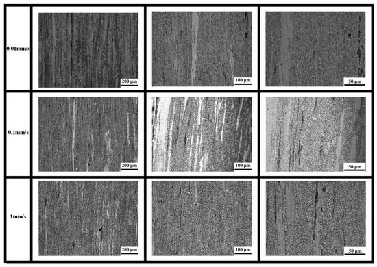 Figure 4 displays OM images of the Mg-4Zn-1Mn-0.5Ca alloy extruded at 300 °C using different speeds (0.01 mm/s, 0.1 mm/s, 1 mm/s). It can be observed that dynamic recrystallization occurs in all Mg-4Zn-1Mn-0.5Ca alloys extruded at different speeds, with varying degrees of completion. The alloy grains exhibit significant refinement. As the extrusion speed increases gradually from 0.01 mm/s to 1 mm/s, the volume fraction of recrystallization in the alloy gradually rises, recrystallized grains grow, and the area of non-recrystallized regions decreases. Furthermore, it is noted that the extrusion speed does not significantly affect the morphology and distribution of second phases within the alloy.