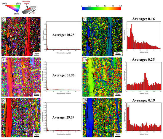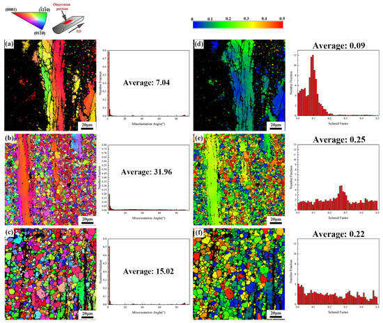 EBSD analysis (including IPF maps, misorientation angle distribution graphs, Schmid factor maps, and Schmid factor distribution graphs) of as-extruded Mg-4Zn-1Mn-0.5Ca alloy with different temperatures; (a–c) and (d–f) represent 260 °C, 300 °C, and 340 °C, respectively.