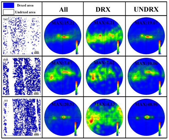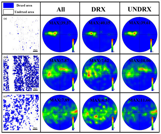 The non-recrystallized distribution of the Mg-4Zn-1Mn-0.5Ca alloy is shown in Figure 9, where the white areas represent non-recrystallized grains and the blue areas signify recrystallized grains [18]. The right side presents texture analyses for three regions corresponding to extrusion speeds of 0.01 mm/s, 0.1 mm/s, and 1 mm/s (Figure 9a–c). It is evident that the basal texture strength of the recrystallized areas in all three alloys is relatively weak. When the extrusion speed reaches 1 mm/s, the basal texture strength of the recrystallized area minimizes at 4.13, while the texture strength of the non-recrystallized area becomes the highest among the three alloys, nearing 49. In general, the trend in basal texture strength in the recrystallized areas of the three alloys shows an initial increase followed by a decrease, with a relatively modest increase. Conversely, the texture pattern in the non-recrystallized areas decreases before rising, mirroring the microstructural texture evolution in the selected alloy regions. This consistency suggests that the alloy’s texture is predominantly influenced by non-recrystallized deformed large grains.