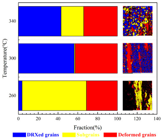 Figure 7 displays the EBSD analysis results of the volume fractions of recrystallized and non-recrystallized regions of the Mg-4Zn-1Mn-0.2Ca alloy after extrusion at 0.1 mm/s speed and different temperatures. Due to the significantly low indexing rate at 260 °C, it is not discussed. It can be observed that with increasing extrusion temperature, the volume fraction of the recrystallized region in the alloy gradually increases, which aligns with the findings from metallographic observations.
