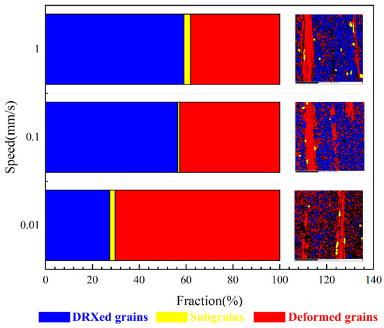 Figure 10 presents the EBSD analysis results of the volume fractions of recrystallized and non-recrystallized regions in Mg-4Zn-1Mn-0.2Ca alloy after hot extrusion at different speeds and the same temperature. Combined with the previous microstructural images, it can be observed that with increasing extrusion speed, the volume fraction of recrystallized regions in the alloy gradually increases. This increase is more pronounced when transitioning from a speed of 0.01 mm/s to 0.1 mm/s, while the increment in the volume fraction of recrystallized regions is less noticeable when going from 0.1 mm/s to 1 mm/s.