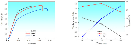 Figure 11 illustrates the tensile mechanical properties of the Mg-4Zn-1Mn-0.5Ca alloy extruded at speeds of 0.1 mm/s at different temperatures (260 °C, 300 °C, 340 °C). The various values summarized from Figure 12 are shown in Table 1. It is observed in the graph that when the extrusion speed remains constant at 0.1 mm/s, after extrusion at 340 °C, the yield strength of the Mg-4Zn-1Mn-0.5Ca alloy is 202 MPa, the ultimate tensile strength is 306 MPa, and the elongation at break is 18.9%. As the extrusion temperature decreases, the yield strength of the alloy increases, the elongation decreases, and the ultimate tensile strength initially rises to 342 MPa, then drops to 329 MPa at 260 °C.