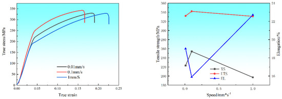 Figure 12 depicts the room temperature tensile mechanical properties of Mg-4Zn-1Mn-0.5Ca alloy extruded at 300 °C with different speeds (0.01 mm/s, 0.1 mm/s, 1 mm/s). The various values summarized from Figure 12 are shown in Table 2. It is evident from the graph that when the extrusion temperature is constant, lower extrusion speeds result in higher yield strength and ultimate tensile strength overall, along with lower elongation at break for Mg-4Zn-1Mn-0.5Ca. When the extrusion speed is 0.01 mm/s, the alloy’s strength is lower than that at 0.1 mm/s, possibly due to excessively prolonged extrusion leading to abnormal furnace temperature control, affecting the mechanical performance of the alloy.