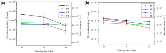 - Yao, S.; Xing, J.; Zhang, J.; Xiong, S.; Yang, Y.; Yuan, X.; Li, H.; Tong, H. Microscopic investigation on sintering mechanism of electronic silver paste and its effect on electrical conductivity of sintered electrodes. J. Mater. Sci. Mater. Electron. 2018, 29, 18540–18546. [Google Scholar] [CrossRef]