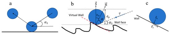 The method assumes that the angle of impact of the particle with the imaginary wall surface is related to the angle (between the particle orientation and the horizontal plane, as shown in Figure 3a) and the wall roughness angle [37], which is given by , as shown in Figure 3b. The probability of can be approximated by a standard deviation of as , where is a normal distribution function, and is a Gaussian random variable with mean zero and standard deviation 1.