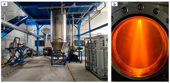 An amount of 20 kg of Gas Atomization Vacuum Power Production Equipment is utilized, and to lower the oxygen content, the atomization chamber, as shown in Figure 4a, is vacuumized (initial pressure of atomization chamber: 0.1 kPa) before the experiment begins. A 304 stainless steel bar is melted with protective gas (argon) in an induction furnace. It is important to note that, in order to prevent the liquid in the valve mouth from solidifying, the alloy liquid and argon valve must be opened simultaneously in order to make the liquid and gas exit simultaneously. The molten alloy outflows through the orifice at the base of the tundish. It then encounters a high-velocity argon gas stream below the nozzle, leading to atomization into fine droplets, as shown in Figure 4b.