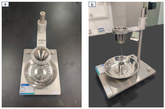 A BT-200 Hall flowmeter (Dandong Boxter Instrument Co., Ltd., Dandong, China) with an outlet orifice diameter of 2.5 mm and 304 stainless steel powder is used in the experiment. The experimental procedure begins with baking the powder at 100 °C for 12 h before using the Hall flowmeter. At a room temperature of 25 °C with a relative humidity of 40%, 50 g of 304 stainless steel powder is then poured into the Hall flowmeter. During the experiment, the time taken for all the metal powder to flow through the funnel hole is recorded to determine the flow rate. The experiment was repeated several times under the same experimental conditions, and the average value was taken. Figure 5 displays a diagram of the Hall flowmeter and the powder outflow process.