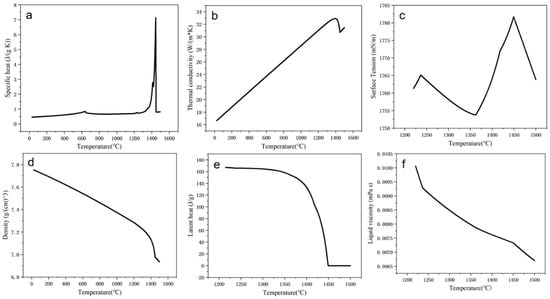 Plot of material parameters of 304 stainless steel as a function of temperature. (a) Specific heat, (b) thermal conductivity, (c) surface tension, (d) density, (e) latent heat, (f) liquid viscosity.
