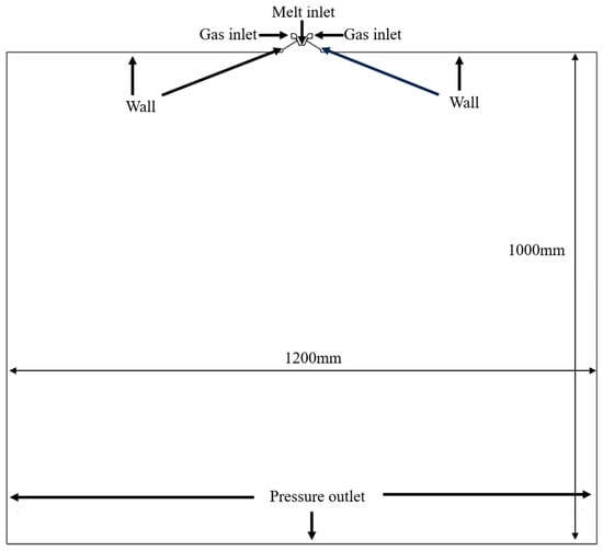 A structured mesh is generated with a total of 1.97 million elements. The boundary conditions are illustrated in Figure 7. The gas inlet pressure is specified as a high-pressure value with an initial temperature of 293 K, and the melt inlet is specified with a constant flow rate with an initial temperature. The outlet pressure is set as standard atmosphere pressure with a temperature of 293 K. The wall surface is specified as a no-slip boundary condition with a temperature of 293 K.