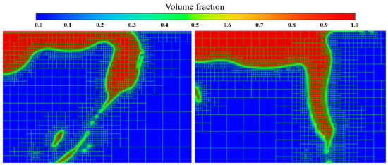 To address the issue, we employ adaptive mesh refinement (AMR) within the VOF model. This approach adaptively refines the grid around the interface at each time step. The interface is identified using the variable of volume fraction (), and the refinement of the interface is initiated when the gradient of is larger than a threshold value (the gradient of should be zero in each single phase, and only has values in the phase transition), as illustrated in Figure 8. The mesh is refined according to the specified criterion as , where re is the grid size after refinement, is the grid size before refinement, and N is the refinement level. We employ a refinement level of 5 to adequately mesh the region far away from the interface, while employing a refinement level up to 9 to satisfy the high resolution requirement near the interface, resulting in a mesh size refined from 200 µm to less than 7 µm.
