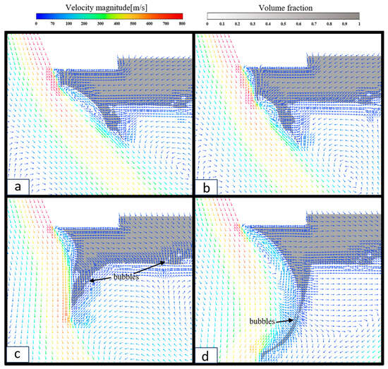 Velocity field during continuous gasliquid interaction: (a) 580 μs, (b) 600 μs, (c) 620 μs, (d) 660 μs.
