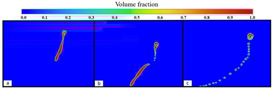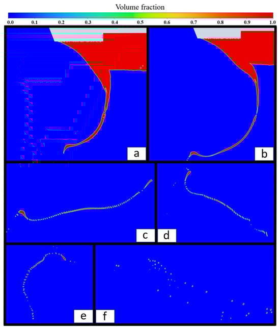 As the film continues to swing, the melt film is separated from the main body due to Rayleigh instability, and then the interface breaks into fine droplets when the shear stress becomes large enough to overcome the surface tension in the primary crushing and secondary atomization, as shown in Figure 11a–f. In secondary atomization process, the Weber number, a crucial dimensionless number, characterizes the tendency of droplets or liquid films to break up [38]. A high Weber number means that the momentum flux is dominant, increasing the likelihood of droplet formation.
