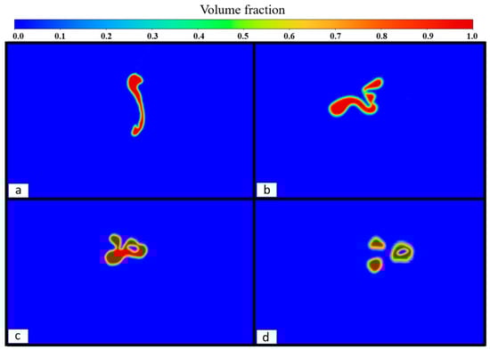 In addition, hollow powders may be formed during the GA process. When gas flows over the surface of the melt, since the film is oscillating under the effect of gas–liquid momentum exchange (Kelvin–Helmholtz (KH) instability [39]), the gas may be entrapped into the liquid film, forming bubbles, as shown in Figure 10c,d. The film that contains bubbles further breaks into droplets, and the retained bubbles turn into voids after solidification, resulting in the formation of hollow powder, as shown in Figure 12a–c. The gas may also be sucked into the droplets during the breakup process due to the bending and closing of the film under shear stress, as shown in Figure 13a–d.