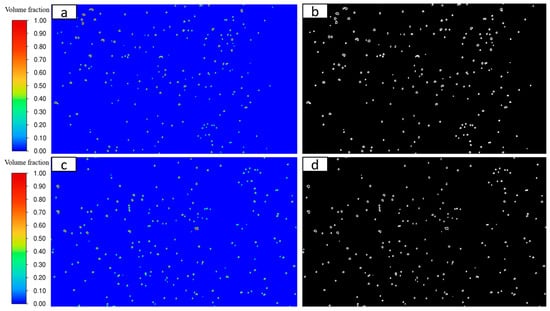 To obtain a comprehensive view of the particle-size distribution, we extracted two sets of simulated data from different regions, as illustrated in Figure 14a,c. The contours of these two powder sets were delineated, as shown in Figure 14b,d. The postprocessing of the original datasets facilitates the statistical analysis and visualization of the particle-size distribution. This figure illustrates that the majority of powder particles generated in the GA simulation exhibit a spherical shape, with a small fraction displaying irregular shapes.